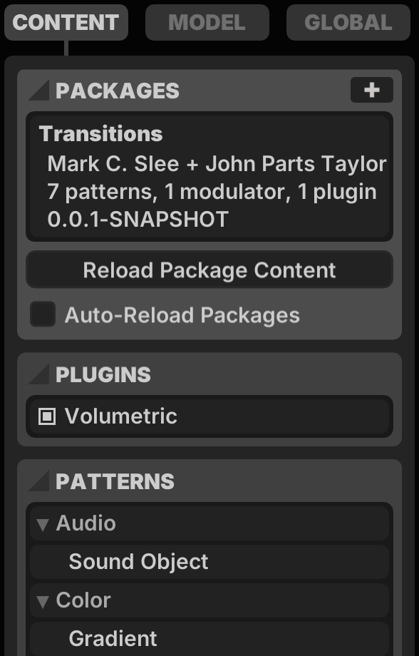 Use the button to re-scan the ~/Chromatik/Packages folder for content packages and reload them without restarting the application. Note that to avoid visual discontinuity, existing instances of patterns, effects, and modulators loaded from a content package are not reloaded. New instances, however, will use the most recently loaded content.