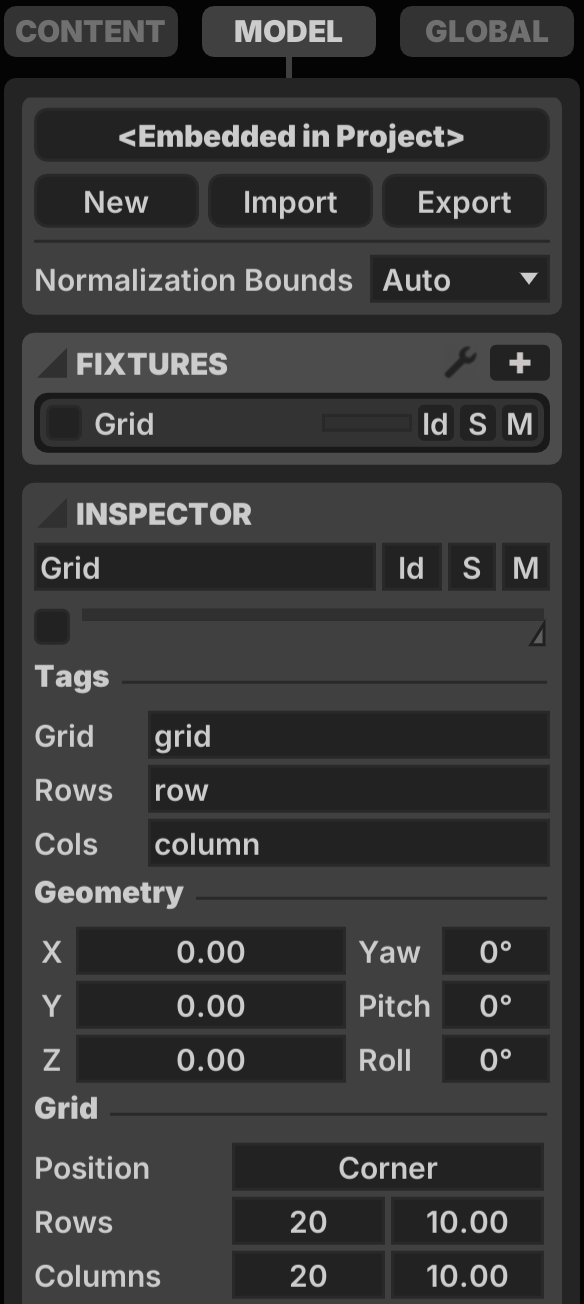 - FIXTURES: Specify a list of lighting fixtures that make up your overall model