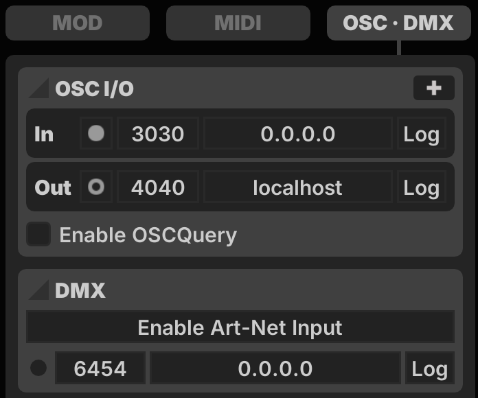 - DMX: Input from DMX devices via Art-Net (See DMX →)