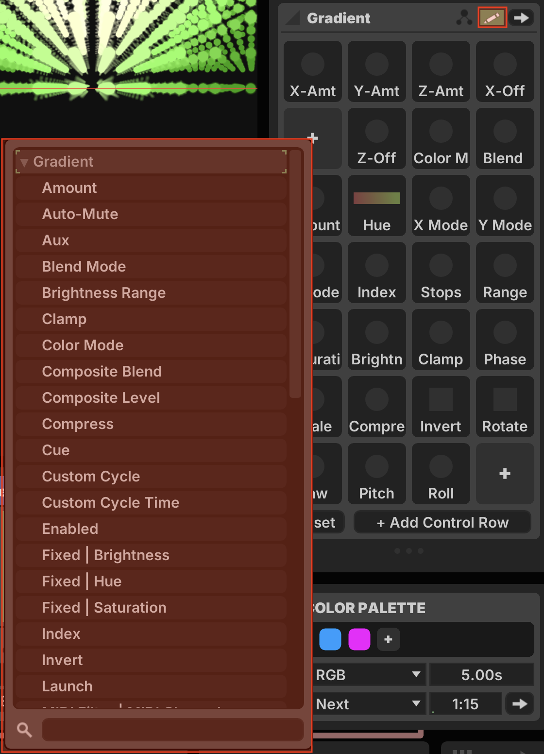 Performance Mode is an alternate UI configuration specifically designed for the live VJ context. The UI is simplified to show only the parameters most crucial to real-time control, with configuration and project building tools largely ommitted.